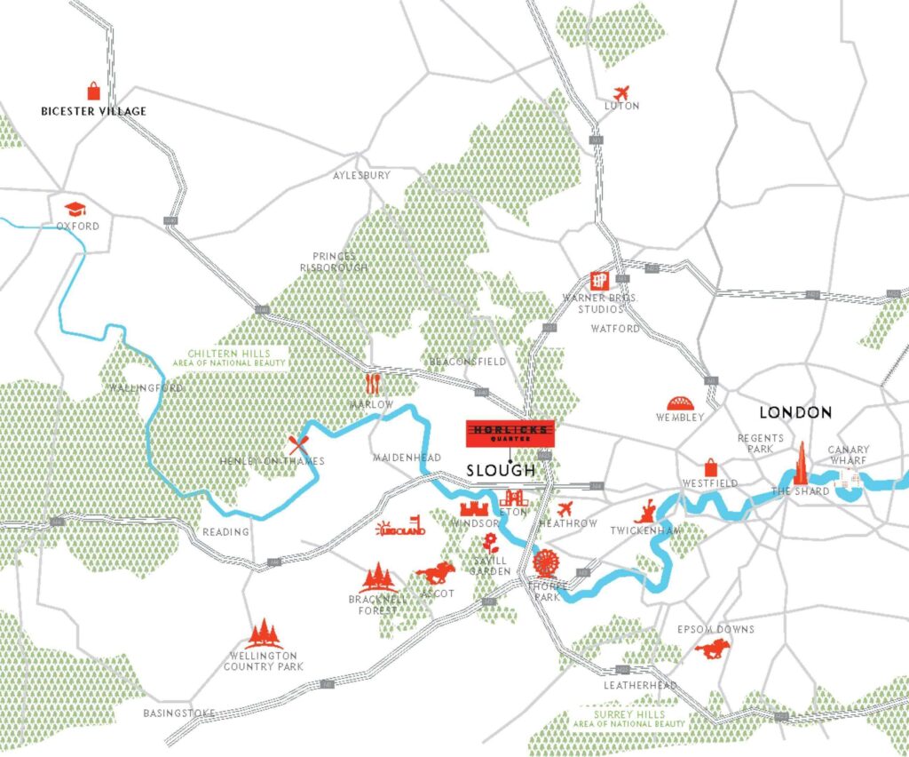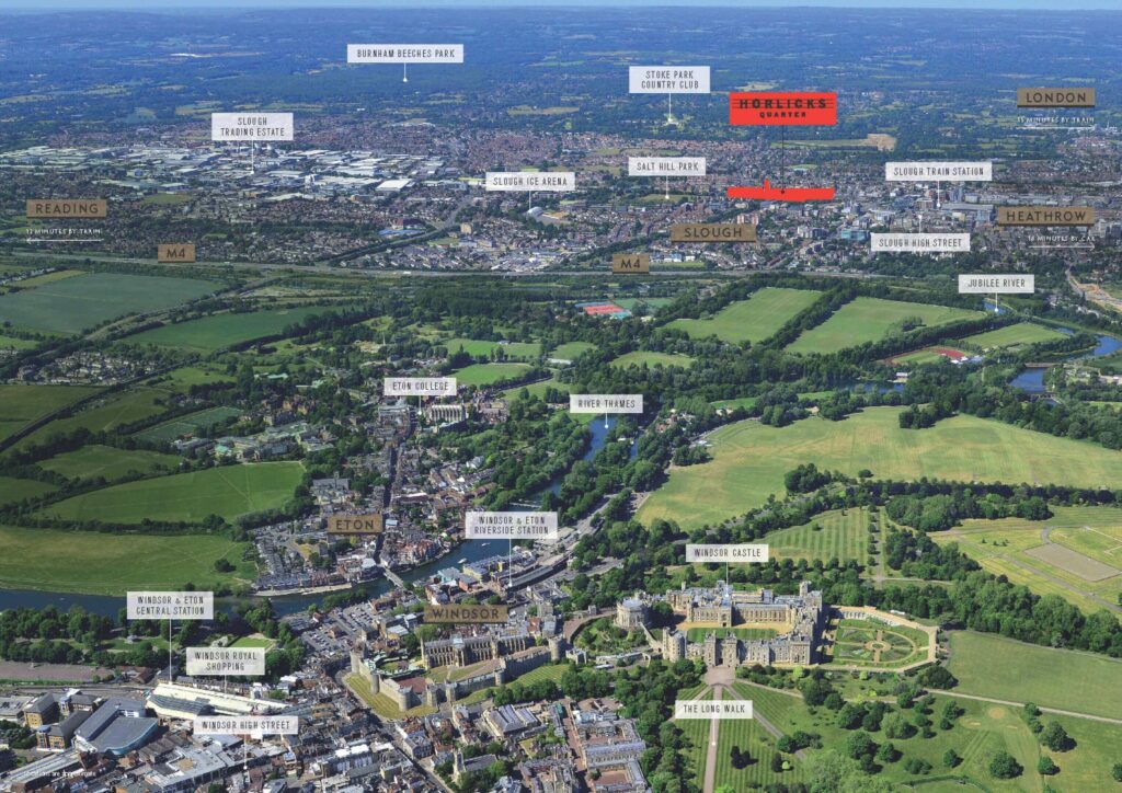 Horlicks Quarter, Slough’a hoş bir yenilik katıyor. Slough, Londra’nın merkezine 22 mil (35 km) ve tarihi Windsor’a 4 mil (6 km) mesafede bulunan, gelişen bir kasabadır. Slough, iş ve istihdam merkezi olup, şu anda 3.5 milyar £’lık büyük bir yeniden yapılanma süreci geçiriyor. Horlicks Quarter, tarih ile modern şehir yaşamının birleştiği, çağdaş bir yaşam için yeni bir vizyon sunuyor.
